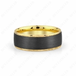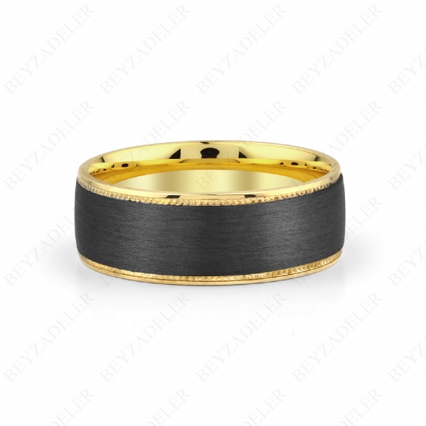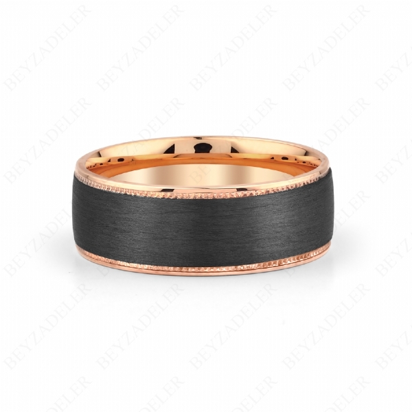 This bold men’s wedding band blends carbon fibre with sleek black, framed by milgrain detailing and rich yellow or rose gold edges. A wide, modern ring with a masculine look, it's perfect for those seeking a manly ring that stands out. Durable, stylish, and timeless—crafted for confidence
