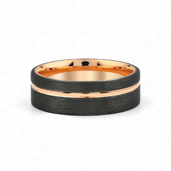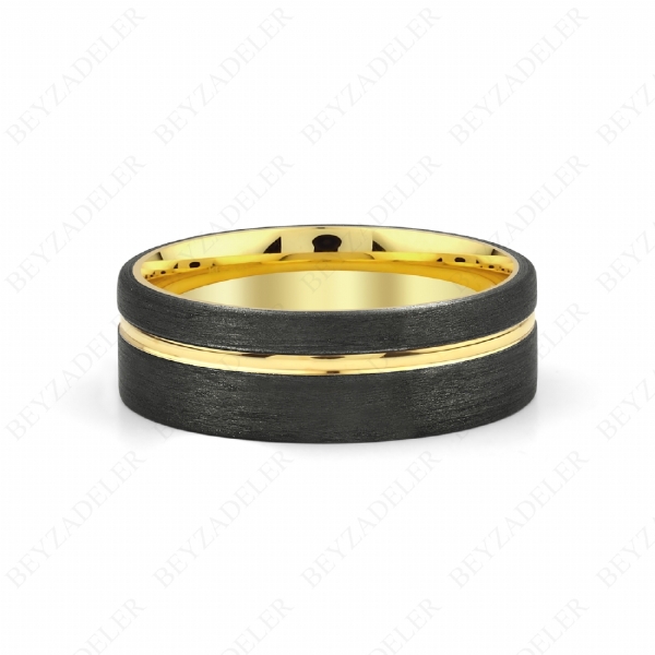 This bold men’s wedding band blends carbon fibre with sleek black, framed by milgrain detailing and rich yellow or rose gold edges. A wide, modern ring with a masculine look, it's perfect for those seeking a manly ring that stands out. Durable, stylish, and timeless—crafted for confidence